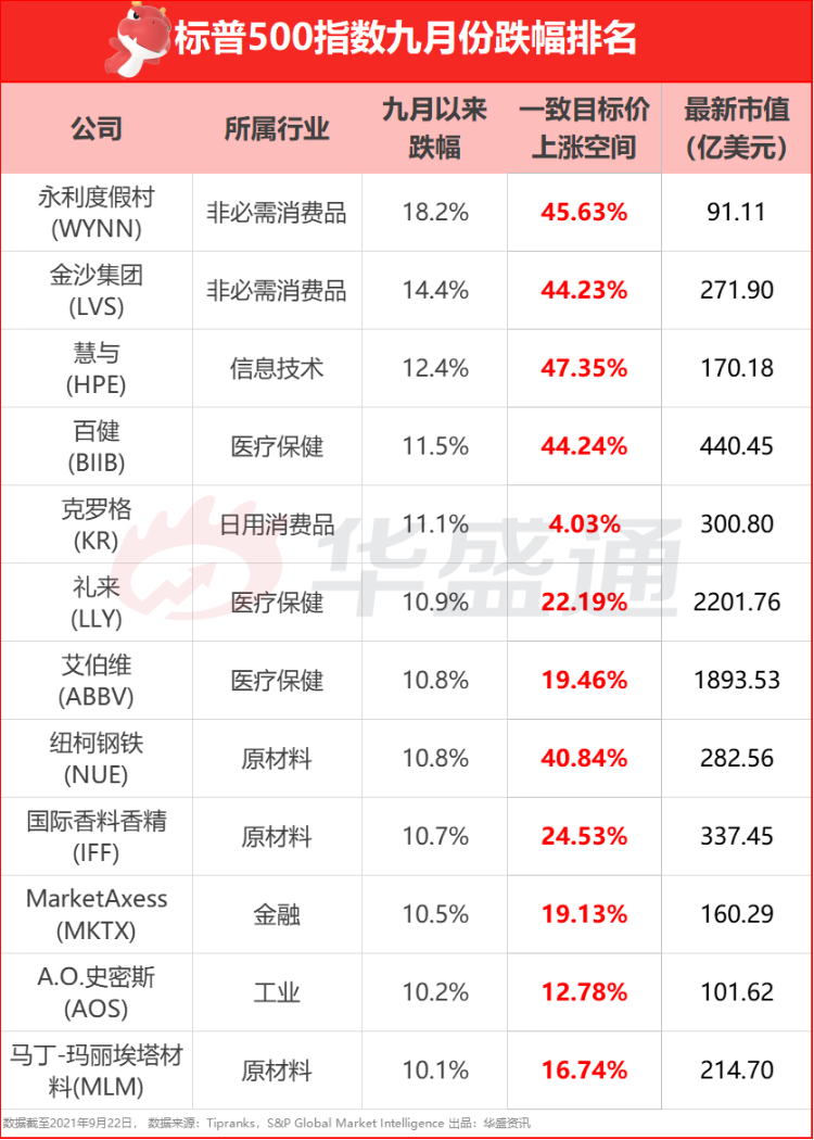 据S&P Global Market Intelligence统计,9月份标普500指数中11只跌幅居前的成分股,包括永利度假村和拉斯维加斯金沙集团等非必需消费品公司,以及生物科技公司百健等,它们的跌幅已经超过10%,这其中有没有错杀股呢?