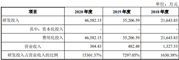 据招股书披露,2018-2020年,公司研发投入分别为2.16亿元、3.52亿元、4.66亿元;分别占总费用的76.02%、76.10%及60.97%;占营业收入1630.38%、7297.05%、15301.37%。研发投入合计超过10亿元,复合年增长率高达46.70%。