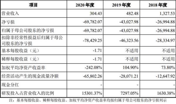 据招股书披露, 2018-2020年,公司分别实现营收1327.53万元、482.48万元、304.43万元;净亏损为2.70亿元、4.30亿元及6.98亿元;扣非净亏损为2.83亿元、4.63亿元及7.84亿元,累计亏损高达15.3亿元。