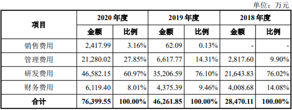 2018-2020年,公司期间费用分别为28,470.11万元、46,261.85万元及76,399.55万元;分别占营收的2144.59%、9588.35%、25095.93%,主要由研发费用与管理费用构成。