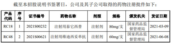 公司表示,截至本招股说明书签署日,荣昌生物已开发了20余款候选生物药产品,其中有10余款候选生物药产品处于商业化、临床研究或IND准备阶段,均为靶向生物创新药;公司已进入临床试验阶段的6款产品正在开展用于治疗20余种适应症的临床试验。