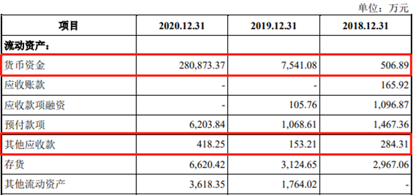 数据显示,2018年、2019年及2020年,公司的货币资金分别为506.89万元、7541.08万元及28.09亿元,占总资产的0.95%、10.94%及68.20%。