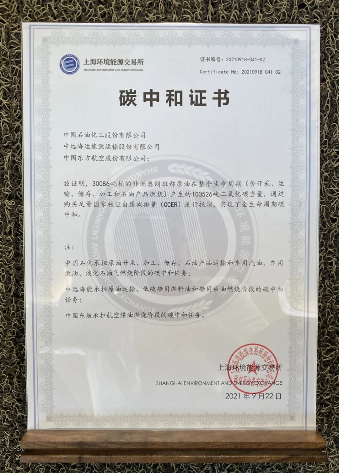 东航获颁的我国首份全生命周期碳中和石油证书