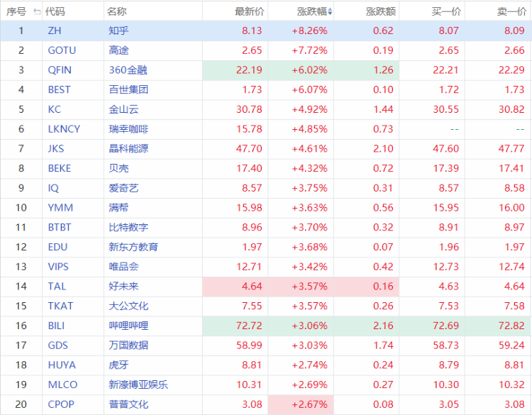 截至发稿,知乎(ZH)涨8.26%,360金融(QFIN)、百世集团(BSET)等涨超6%,金山云(KC)、瑞幸咖啡(LKNCY)、晶科能源(JKS)、贝壳(BEKE)等涨超4%,哔哩哔哩(BILI)、唯品会(VIPS)、满帮(YMM)等涨超3%;