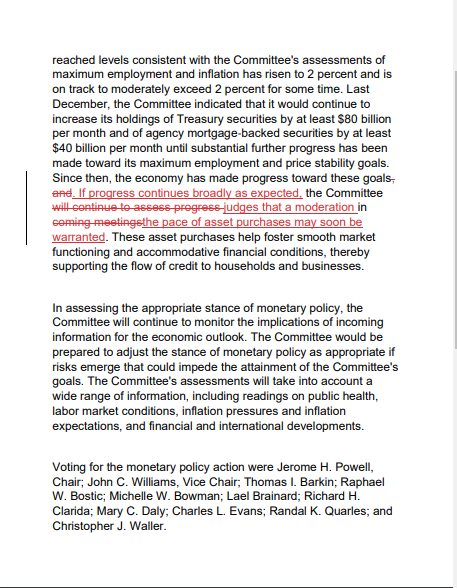 FOMC的声明中写道:“如果进展与预期大致一致,FOMC判断,资产购买步伐可能很快就会放缓。”