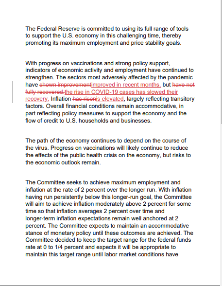 随着疫苗进展和强有力的政策支持,经济活动和就业指标持续加强。受大流行病不利影响最大的部门近几个月有所改善,但新冠肺炎病例的上升使得复苏步伐放缓(已显示出改善,但尚未完全恢复)。通货膨胀率位于高位(上升),主要反映了暂时性因素。整体金融状况保持宽松,这部分是因为支持经济的政策措施以及流向美国家庭和企业的信贷。