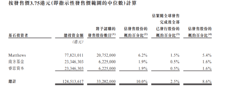 基石投资者Matthews、南方基金及睿思资本将分别认购7782.1万港元、2334.63万港元、2334.63万港元,占发售股份10%。