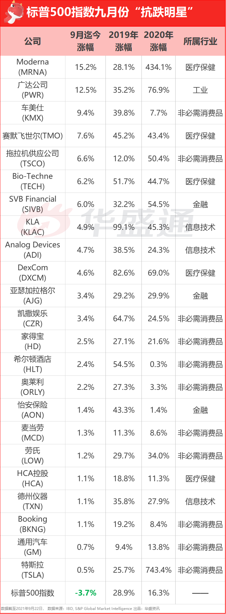 在“九月魔咒”的压力之下,在标普500指数中,近23只股票——包括医疗股Moderna (MRNA)和DexCom (DXCM)以及非必需消费品股特斯拉(TSLA)——在9月份逆势上涨,而其他成分股则平均下跌3.2%,跌破了关键支撑位。