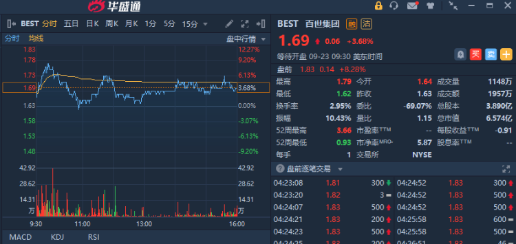 百世集团(BEST)盘前涨逾8%,消息称百世集团考虑出售快递子公司,估值或至多达10亿美元。