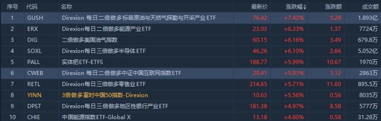 从ETF涨幅榜来看,涨幅居前的ETF集中做多能源、做多中国互联网指数、做多银行产业ETF;其中,每日二倍做多标普原油与天然气ETF $GUSH 大涨7.42%,成交额1.893亿美元;每日二倍做多能源产业ETF $ERX 涨6.33%,成交额7724万美元。