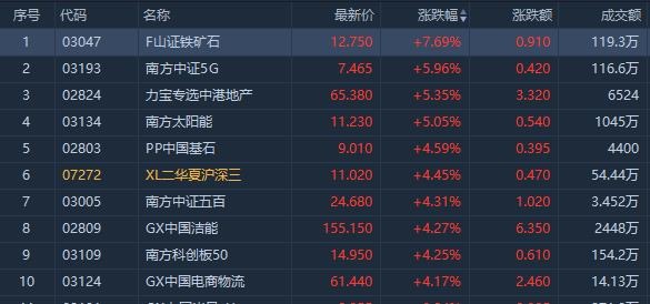 今日港股市场,涨幅居前的有F山证铁矿石ETF $03047.HK 大涨7.69%;南方中证5G $03193.HK 、力宝专选中港地产 $02824.HK 和南方太阳能 $03134.HK 均涨超5%。