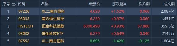 南方两倍做多恒科 $07226.HK 涨1.52%,成交额2.087亿港元;