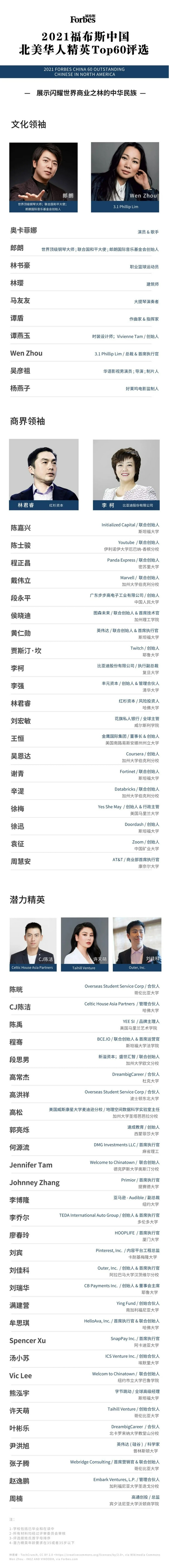 他们的成功不是一蹴而就,而我们很庆幸在今天找到了他们,并有机会把他们的故事分享给大家。以下是60位北美华人精英名单,排名依照姓名首字母排列: