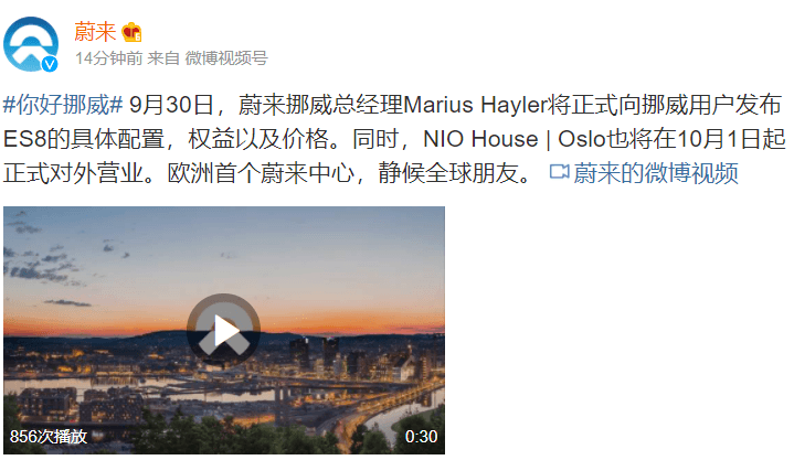 据蔚来微博,9月30日,蔚来汽车挪威总经理Marius Hayler将正式向挪威用户发布ES8的具体配置,权益以及价格。同时,NIO House | Oslo也将在10月1日起正式对外营业。