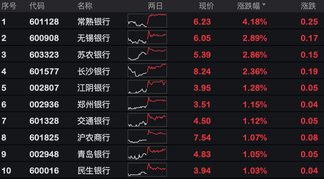 到了23日,随着市场情绪消化,银行股多数翻红。截至当日收盘,A股41只银行股中,32只股价较22日上涨。其中,常熟银行涨幅最高,达4.18%,收报6.23元/股;其次是无锡银行和苏农银行,涨幅分别为2.89%和2.86%,收盘价分别为6.05元/股和5.39元/股。