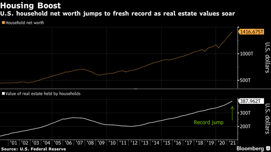 美国家庭净资产在第二季度升至纪录新高,因股票大涨且房产以前所未有的幅度升值。