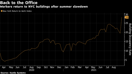 根据安全公司Kastle Systems,截至9月15日,纽约地区约28%的上班族回到办公室。该公司数据是基于门禁卡刷卡情况。这明显高于前一周19%的水平,并创下2020年3月封锁开始以来的最高水平。
