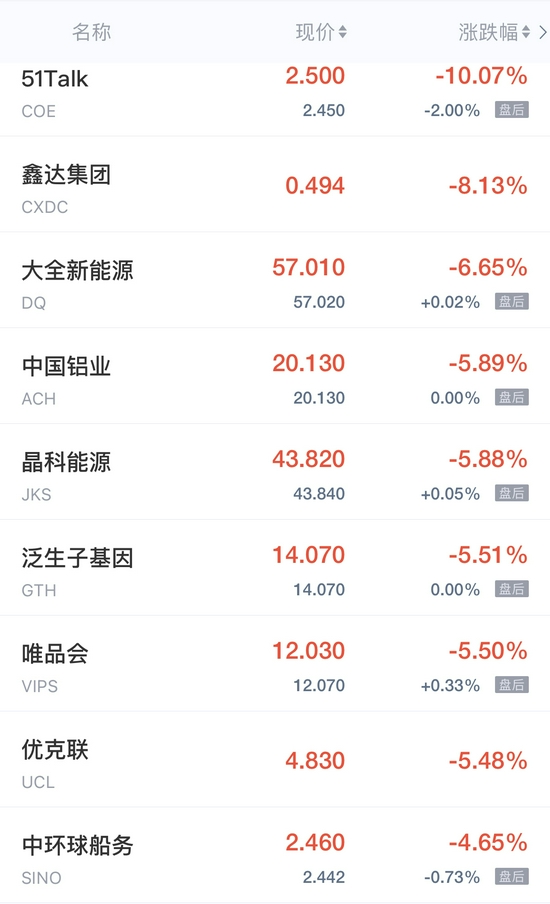 51Talk跌超10%,晶科能源、中国铝业跌近6%,唯品会、优克联跌超5%,中环球船务、微美全息跌超4%,一起教育跌近4%,新东方、世纪互联、迅雷、小牛电动、贝壳跌超1%,网易有道、乐居跌近1%。