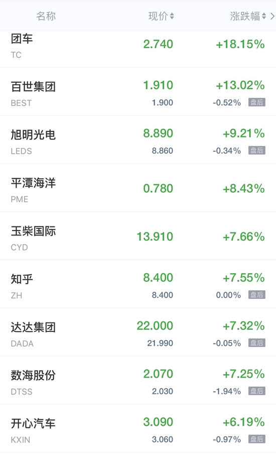 团车涨超18%,百世集团涨超13%,知乎、达达集团涨超7%,开心汽车涨超6%,途牛涨超5%,优信涨近3%,满帮涨超2%,人人公司、中网载线、房天下、携程、第九城市涨超1%,斗鱼、哔哩哔哩、腾讯ADR涨近1%。