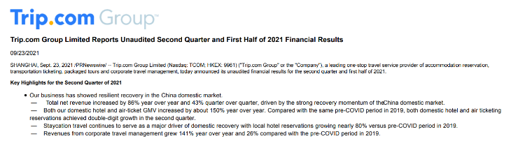 北京时间2021年9月24日, 携程集团(纳斯达克:TCOM及香港联交所:9961)公布了截至2021年6月30日第二季度未经审计的财务业绩。