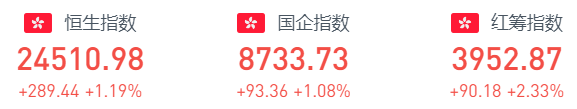 截至9月23日周四收盘,恒生指数上涨289.44点或1.19%,报24510.98点;国企指数上涨93.36点或1.08%,报8733.73点;红筹指数上涨90.18点或2.33%,报3952.87点。