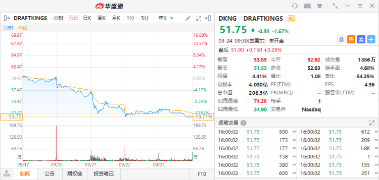 DraftKings周内股价累计下挫14.35%。仅仅在前三个交易日,DraftKings市值就蒸发了31亿美元。截至周四收盘,该股收报51.75美元,较其52周高点跌去30%。