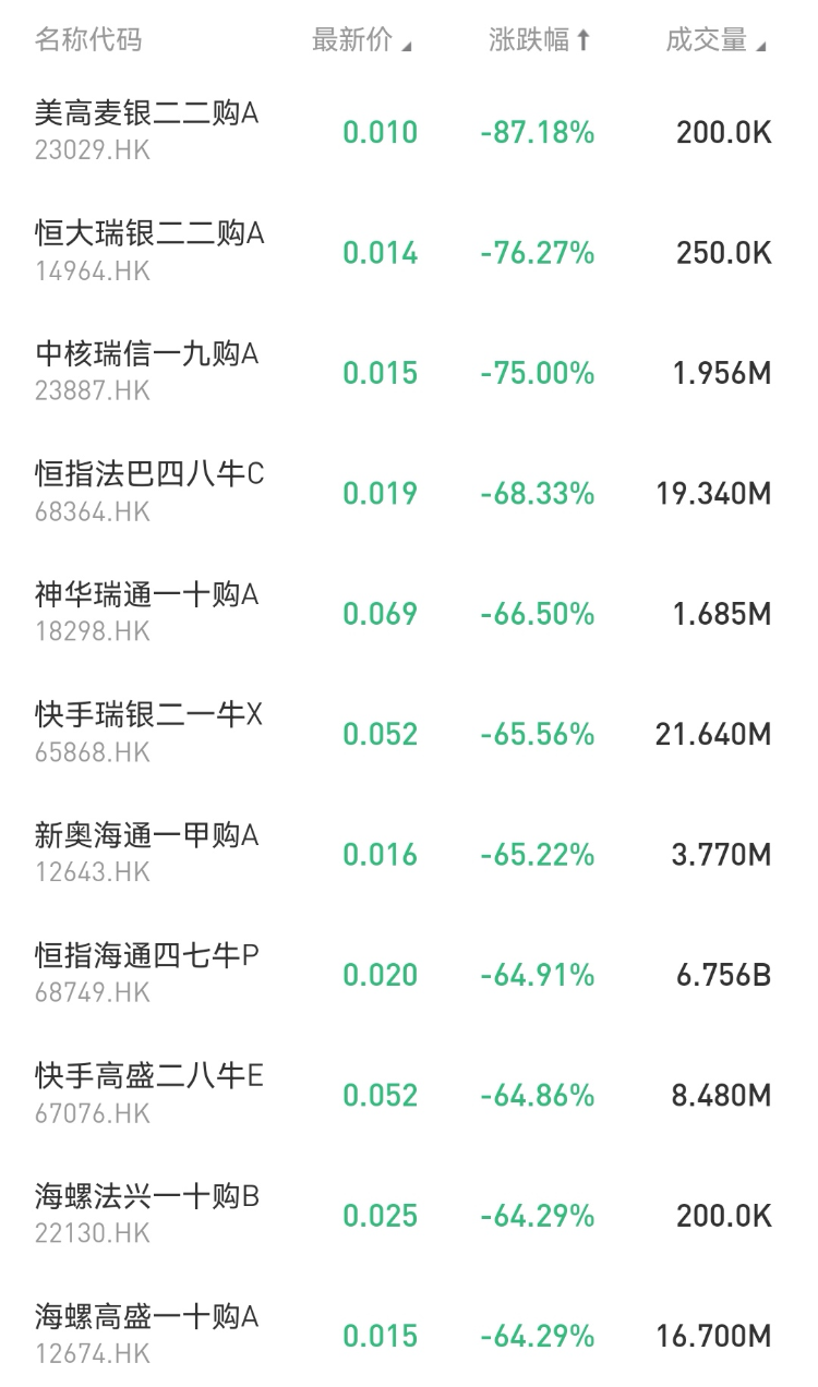 在今日跌幅榜中,$23029.HK 美高麦银二二购A跌87.18%, $14964.HK 恒大瑞银二二购A跌76.27%。