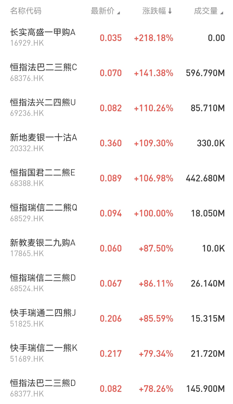 涨幅居前的包括: $68376.HK 恒指法巴二三熊C涨141.38%,成交额2522万港元;此外,快手瑞通二四熊J涨85.59%。