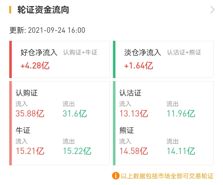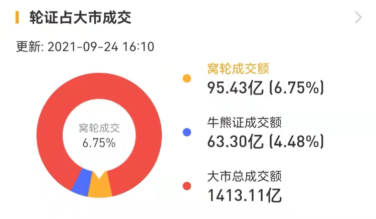 其中,窝轮总成交额95.43亿港元,牛熊证总成交额63.30亿港元。