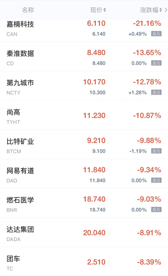 热门中概股周五收盘普跌,区块链板块走低,嘉楠科技暴跌逾21%。