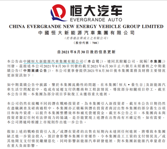 恒大汽车发布公告,鉴于本集团流动性的问题,在本集团恒大‧养生谷及新能源汽车生活空间配套中,造成有延迟支付供应商和工程款情况,导致部分相关项目停工。截至本公告日期,本集团为部分项目争取复工未获得重大进展。