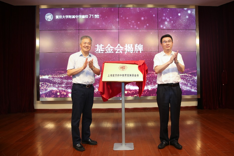 上海市教卫工作党委副书记、市教委副主任闵辉(右)和复旦附中校长吴坚(左)共同为上海复旦附中教育发展基金会揭牌。 本文图片均为校方提供