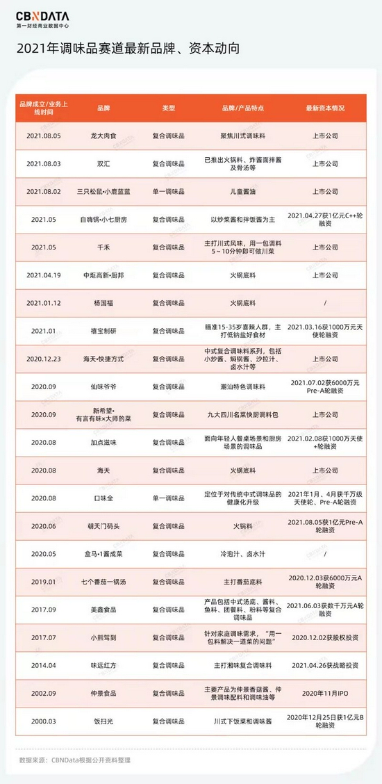 不久前的9月7日,专注家庭调味品的“小熊驾到”完成了A轮融资;8月5日,中式复合调味料品牌“朝天门码头”获得1亿元Pre-A轮融资。7月15日,新锐潮汕风味食品公司“仙味爷爷”宣布完成6000万人民币Pre-A轮融资,由源码资本领投、高瓴创投跟投。6月3日,复合调味品公司美鑫食品完成A轮数千万人民币融资,由金鼎资本独家投资。