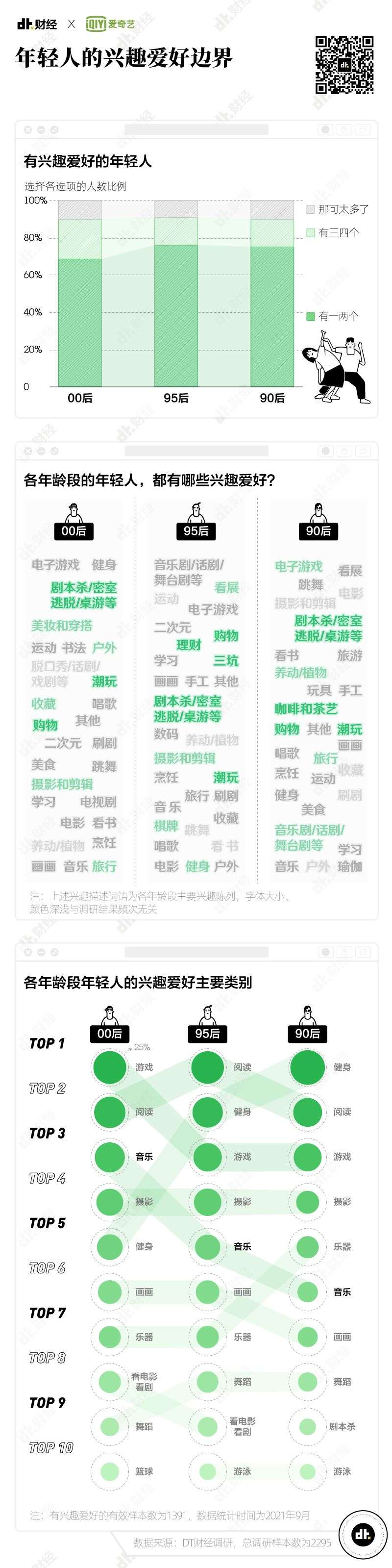 9月,我们联合爱奇艺发起了《2021当代年轻人兴趣爱好大调查》。年轻人的兴趣与热爱,也是爱奇艺一直以来的重点发展方向。围绕这一点,爱奇艺陆续推出了说唱类综艺、针对舞蹈爱好者的《舞蹈生》、围绕年轻人喜欢的剧本杀密室等线下娱乐的“迷综季”…… 综艺内容和年轻人的兴趣热爱,正在相互呼应和影响,而由此焕发出的庞大活力也在不断拓展更多人对文化与消费领域的边界。