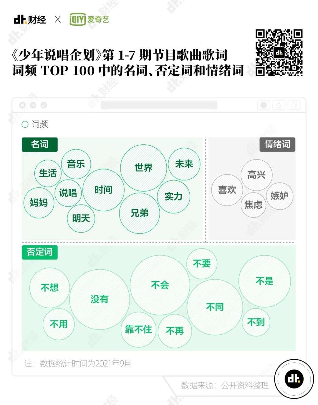 那么,年轻人都想表达什么呢?我们采集了爱奇艺《少年说唱企划》第1-7期节目中18-24岁年轻说唱爱好者的歌曲歌词。