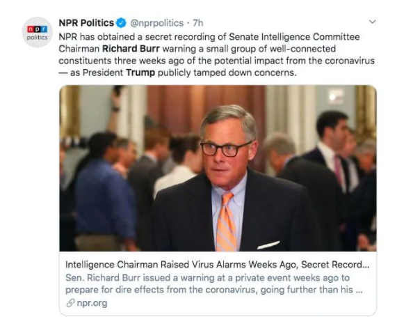 美国全国公共广播电台(NPR)曾发布一篇独家报道,指出美国国会参议院情报委员会的主席理查德·伯尔(Richard Burr),曾在2月中上旬美国股市崩溃之前,一边对公众表示美国的疫情可防可控,一边却抛掉了大量的股票。