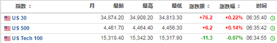截至发稿,道琼斯工业平均指数期货上涨 76.2 点。标准普尔 500 指数期货上涨 0.14%,纳斯达克 100 指数期货微跌0.07%。