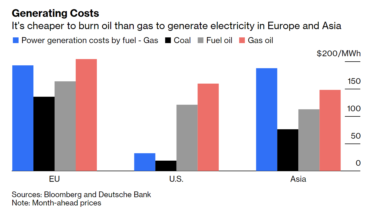 虽然原油稳步上行,但天然气的走势则更加夸张。最新的调查显示,欧洲市场的液化天然气供应和管道运输成本跃升至创纪录水平,电力生产者和消费者都在寻求从昂贵的天然气转向价格稍低的石油,此举也开始对石油市场产生连锁反应。