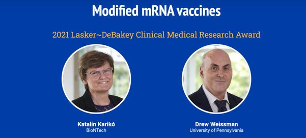 临床医学研究奖方面,来自BioNTech的Katali Karikó和宾夕法尼亚大学的Drew Weissman获得拉斯克临床医学研究奖,他们发现了一种基于mRNA修饰的新治疗技术,并以此能够快速开发高效的COVID-19疫苗。