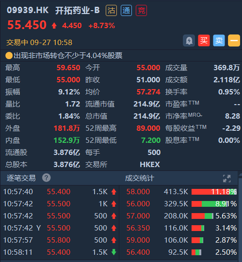 截至发稿,开拓药业涨8.73%,报55.45港元,总市值超214亿港元。