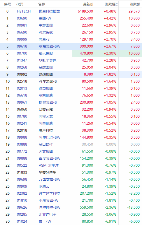 其中,美团大涨4%领涨恒生科指,中芯国际、海尔智家、京东、网易涨近3%,腾讯、华虹半导体涨超2%;快手大跌逾7%,比亚迪电子、跌超3%,哔哩哔哩跌超2%。
