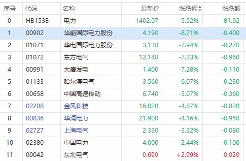电力股集体回调,华能国际电力跌超8%,东方电气、大唐发电跌超7%,哈尔滨电力跌超6%,华润电力跌超4%,上海电力跌超3%,惟东北电气逆市涨超2%。