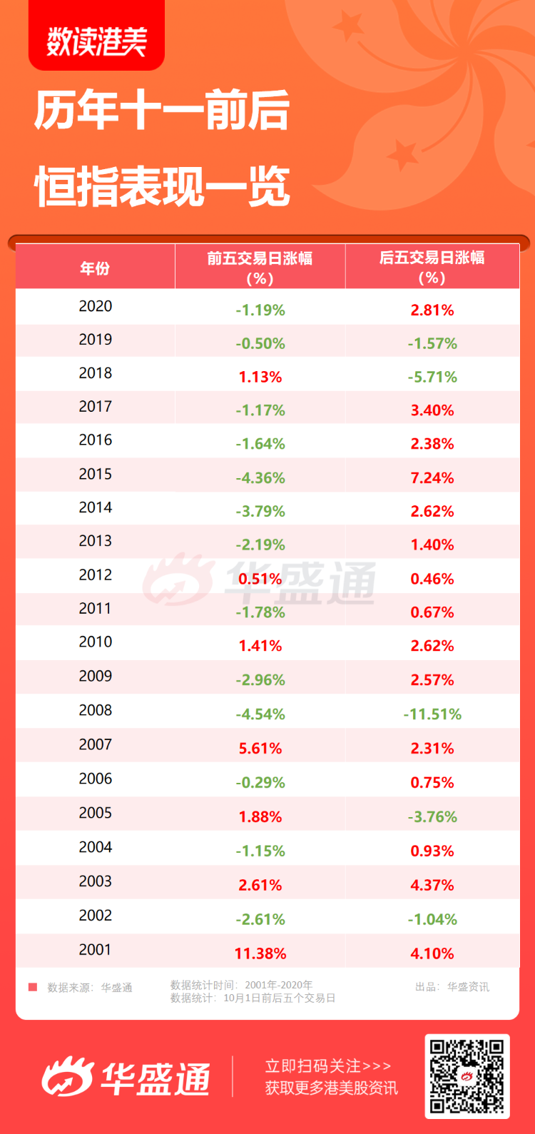 在过去20年间(2001至2020年),10月1日前五个交易日,恒指7年上涨,13年下跌,上涨年份平均涨幅3.50%,下跌年份平均跌幅2.17%。其中近十年来,仅2年在10月1日前五个交易日上涨。