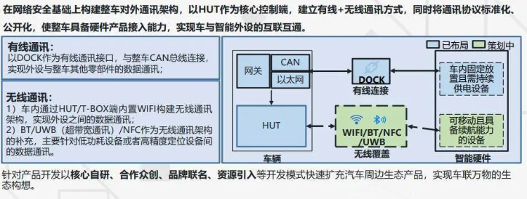 首先是底层技术的搭建。主要是在通讯架构层面,搭建整车对外通讯架构,采用有线+无线通讯方式,来实现整车与外部设备互联互通。