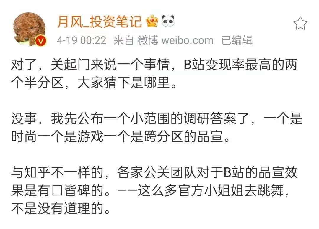 沣京资本基金经理吴悦风曾在微博上分享,“B站变现率最高的两个半分区,一个是时尚一个是游戏一个是跨分区的品宣。与知乎不一样的,各家公关团队对于B站的品宣效果是有口皆碑的。——这么多官方小姐姐去跳舞,不是没有道理的。“