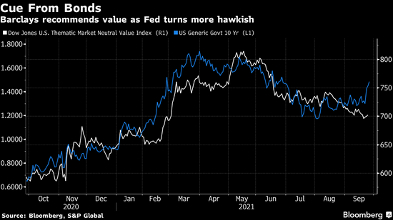 “鉴于政策方向是朝更鹰派(或更不鸽派)的方向前进,我们认为很难押注收益率上行,”巴克莱Emmanuel Cau领导的团队在上周报告中写道。“这将给股市一些持仓较高的长久期资产带来压力,帮助市场回归通货再膨胀或价值题材。”