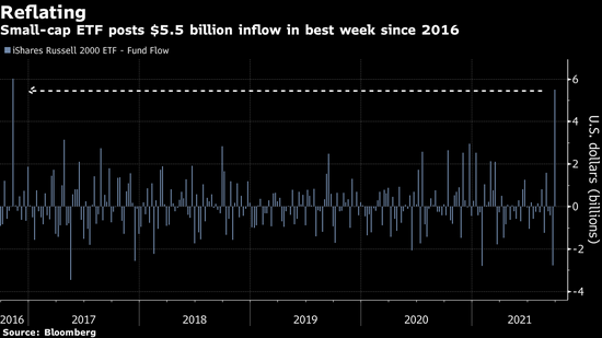 价值股和金融股这些与经济周期相关的股票正在反弹,追踪罗素2000指数的最大交易所交易基金(ETF)获得55亿美元认购,为五年来最大规模资金流入。