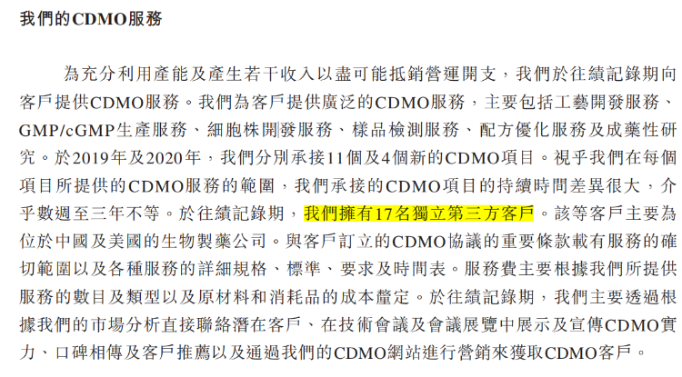 CDMO为创胜集团贡献了大部分的收益,2019年及2020年,创胜分别承接了11个及4个新的CDMO项目,拥有17名独立第三方客户。