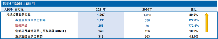 而从财报可以发现,四环医药的主要收入却并非来自医美,而是仿制药。2021年上半年,公司非重点监控目录仿制药收入高达11.9亿元(人民币,单位下同),同比增长122%,势头仍相当强劲。而医美产品作为公司新业务取得2.58亿元的收入,由于去年同期基数较小,使得本期收入同比狂增772%。但绝对值和仿制药相比,仍存在较大差距。
