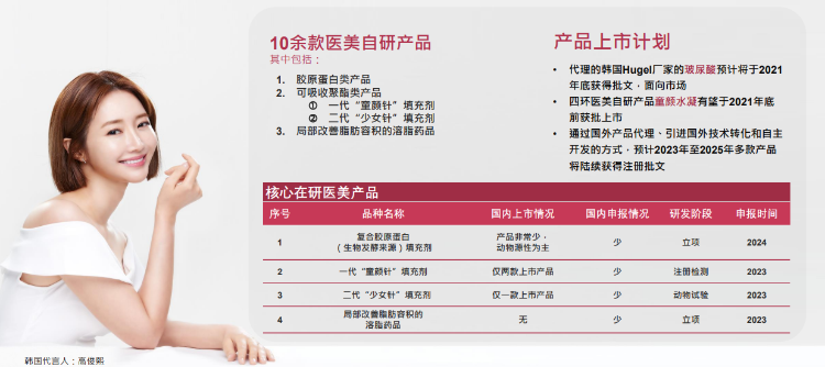 而四环医药在医美产品自主研发实力上十分强劲,在研产品池亦十分丰富。公司目前拥有10余款医美自研产品,包括胶原蛋白类产品、可吸收聚酯类产品、局部改善脂肪容积的溶脂药品等,医美布局趋于多元化。